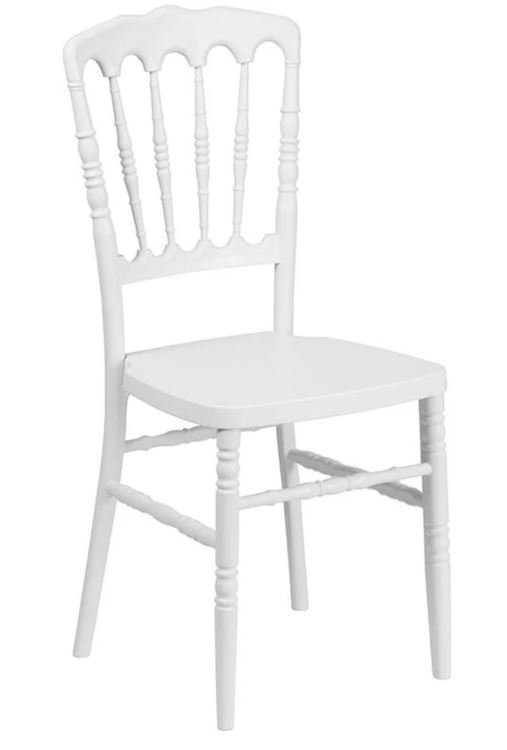 WhiteNapoleon Back Chair:White 1Dropdown02610198_15056570100 The White Resin Napoleon Back Chair is the wedding and party scene. The Luxurious back is ultra contemporary. Super thick vinyl cushion for max comfort.