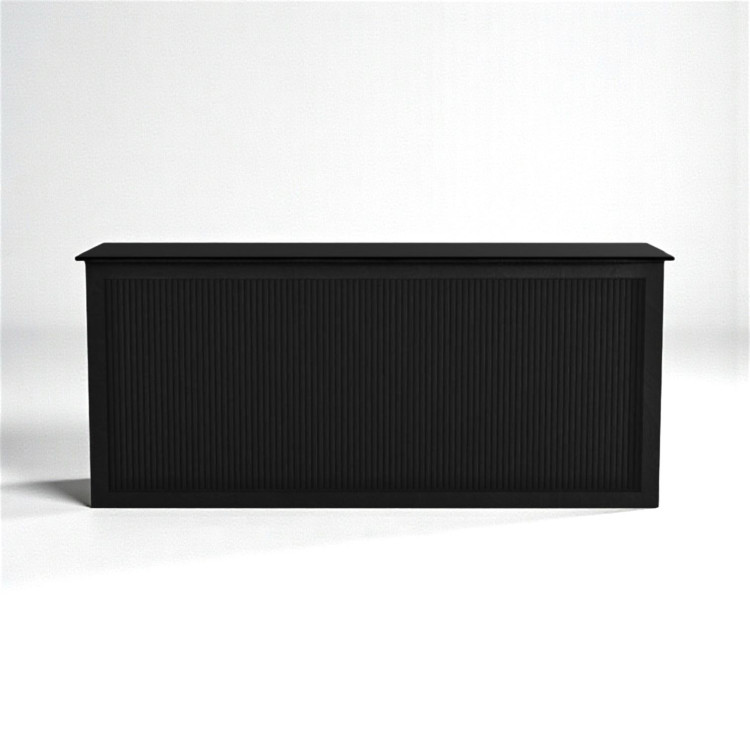 This elegant 5-foot bar features a sleek black wood frame accented with natural rattan detailing, perfect for setting a chic vibe at any event. It's designed to create a stylish, inviting space where guests can relax and grab your favorite drink.