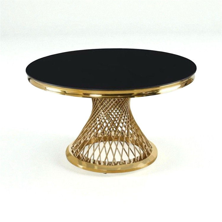 Sleek and glamorous, the Gold Buckingham 60" is a round accent table built to elevate any event with high-end style. A black marble-look top sits on a polished gold rim and an eye-catching sculptural base made of twisted gold rods that form a graceful hourglass silhouette. At 60 inches across it’s compact enough for lounge groupings, sweetheart tables, or intimate cocktail areas while still giving you a sturdy surface for drinks, décor or a small display. The luxe gold finish and marble-detailed top read modern-meets-classic, making this table a versatile choice for weddings, VIP lounges, photo backdrops, and upscale receptions where refined detail matters. Lightweight enough to move for setup yet stable in use, it pairs beautifully with matching gold accents or crisp white acrylic tops and can be dressed with linens, florals, or signage to match your event theme.