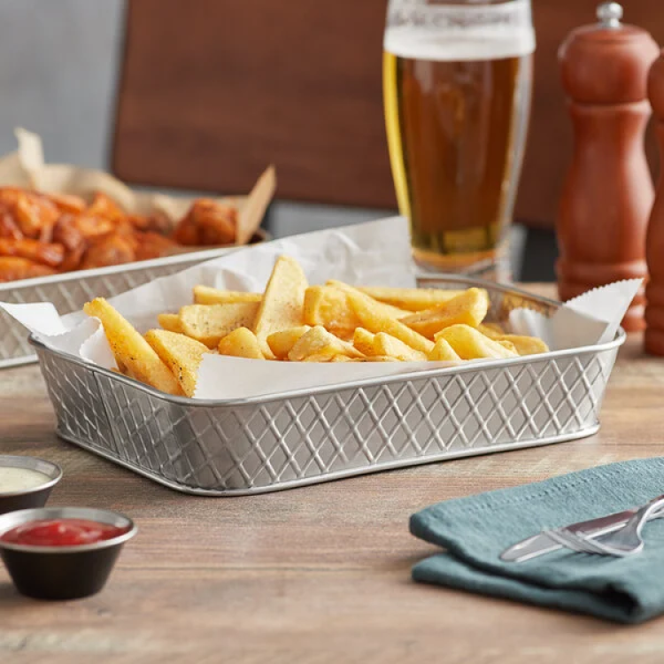 This Tablecraft 10038 Lattice 9 1/2" x 6 1/2" rectangular stainless steel platter is the perfect way to add a casual yet sleek touch to your dining tables! While its shining, silver color promotes an eye-catching display, its imprinted basket weave pattern lends a unique appearance that'll enhance the look of your signature appetizers, sides, and small entrees. Use it to serve your specially-seasoned fries, mouth-watering hot wings, or Mexican dishes in style.