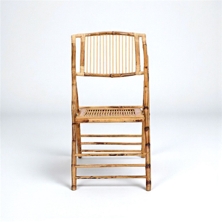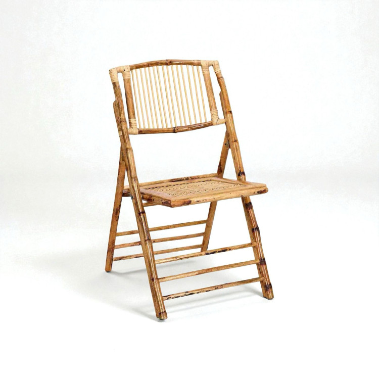 File photo; actual item may vary. This lightweight folding chair is crafted from natural bamboo and rattan for a warm, organic look that suits casual gatherings, garden parties, or relaxed indoor events. Its slatted seat and vertical rattan-back provide breathability and a slightly rustic, tropical feel, while the folding frame makes setup, storage, and transport simple. Expect a compact footprint when folded and an easy-to-place seating option that pairs well with neutral linens, wood tables, or outdoor decor. Gentle wear or variations in color and grain are normal and add to the chair’s natural character.